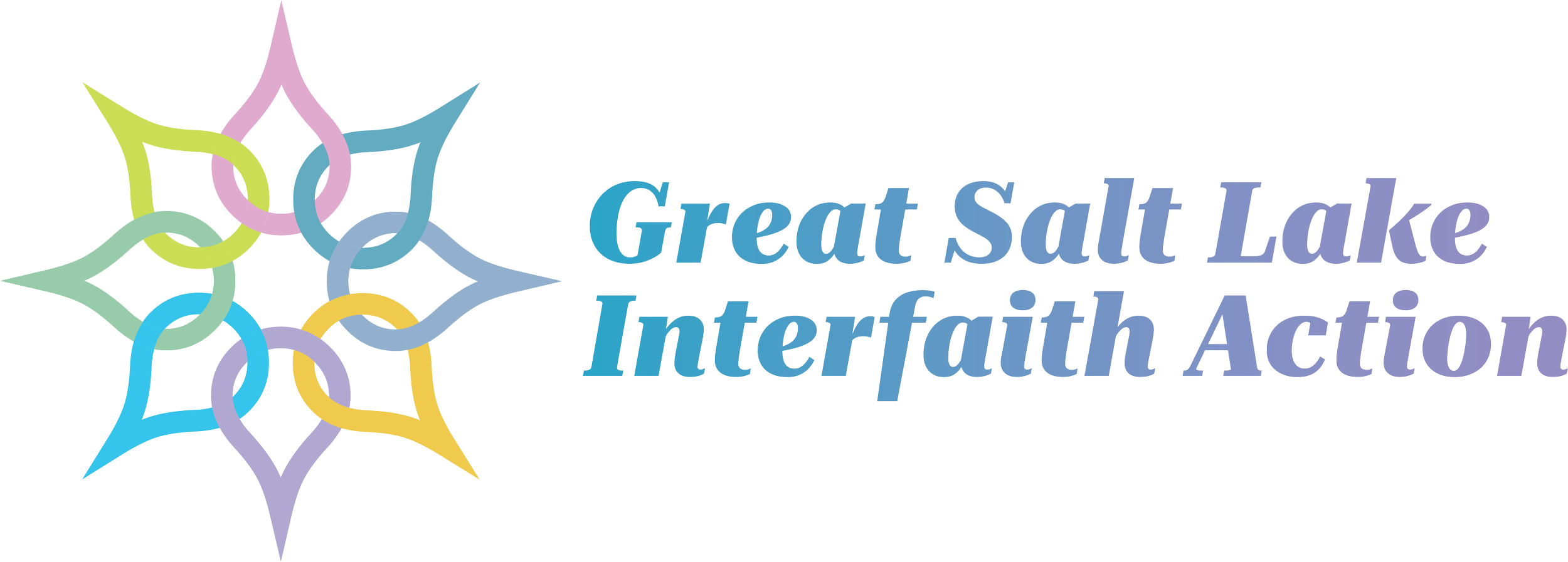 ”Multi-colored water drops intertwine to show unity and strength. Radiating outward, they convey flourishing, optimism, and faith. Core colors are drawn from the lake and landscape within and around it to reinforce those concepts. The typeface suggests action and flow through its tilt and letter forms. The “f” in faith accentuates the word, bringing more attention to both the “inter” and the “faith.” The typeface is readable, bold, contemporary, yet classic.”